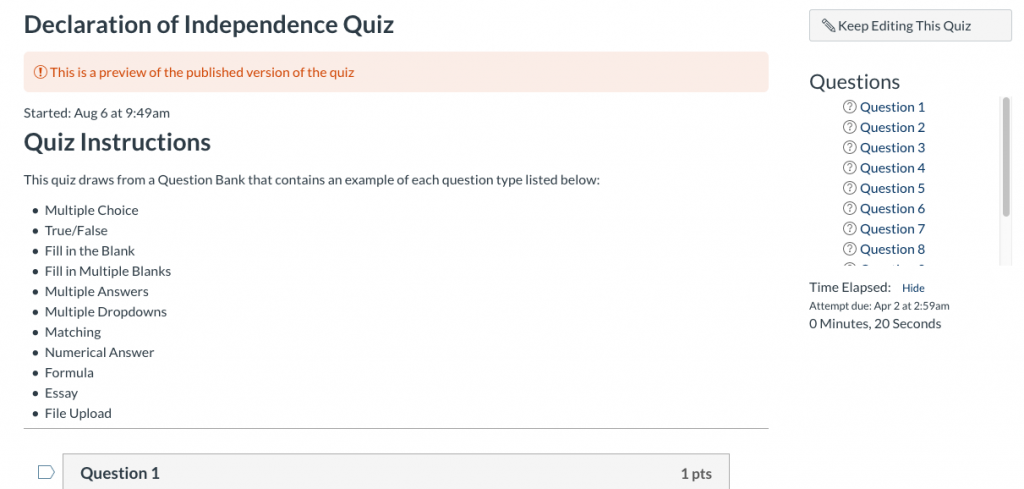 Begin answering the questions. Each professor may have a different layout or format of the test but the general format looks like this. Click the submit quiz button at the bottom when you are finished. You will get a confirmation popup asking you to verify that you are ready to submit your assessment.