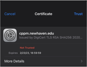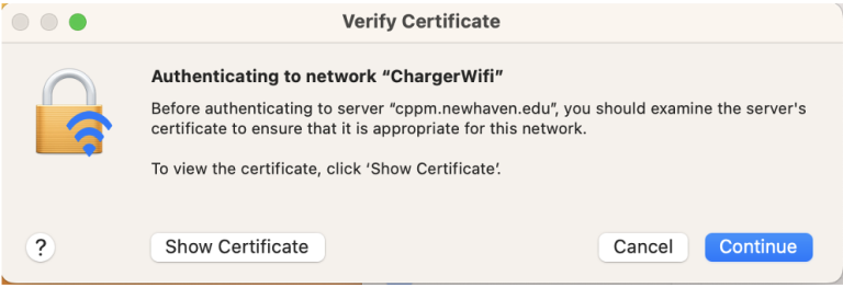 Enter your University of New Haven myCharger username (do not include @unh.newhaven.edu) and password. Just click “Connect” to accept the new certificate.