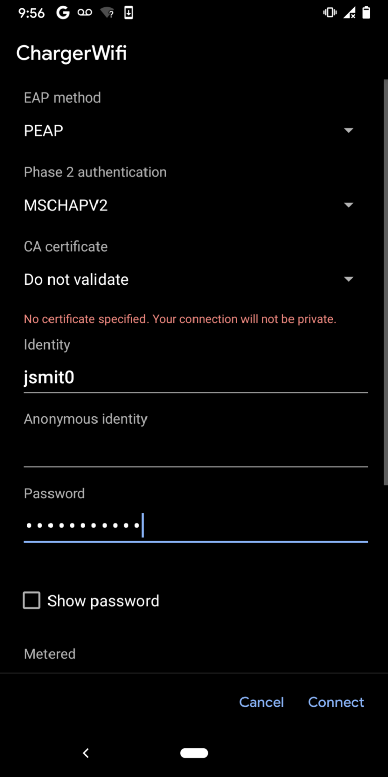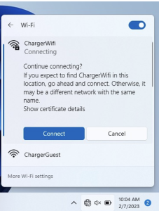 You can connect your device to ChargerWifi by clicking on the wireless SSID in your device’s list then entering your university network credentials at the prompt.
