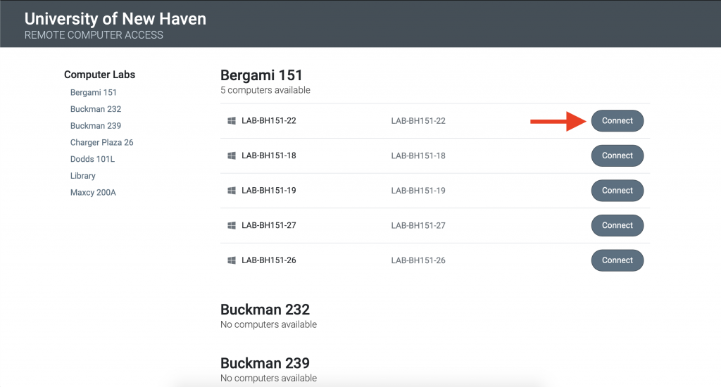 Go to https://remoteaccess.labstats.com/university-of-new-haven, and then choose which desktop you would like to use by clicking “Connect”. You can remote into computers in the following locations: Bergami 151, Charger Plaza 26, Dodds 101L, Library, and Maxcy 200A.