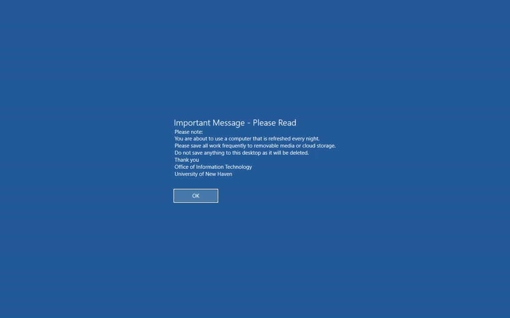 You are prompted with the “Important Message” that comes up when logging into a University device. Please read, and then click “OK”.